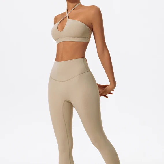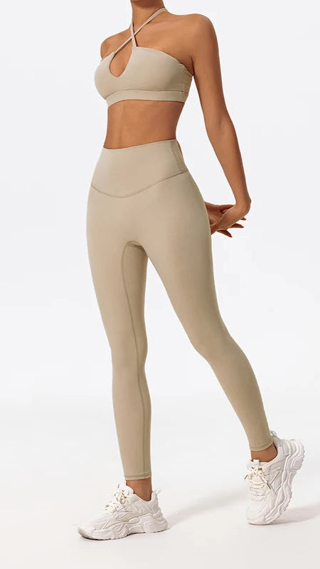 Brassière à bretelles croisées réglables et legging taille haute gainant, pensés pour conjuguer maintien, confort et liberté de mouvement lors de chaque entraînement.